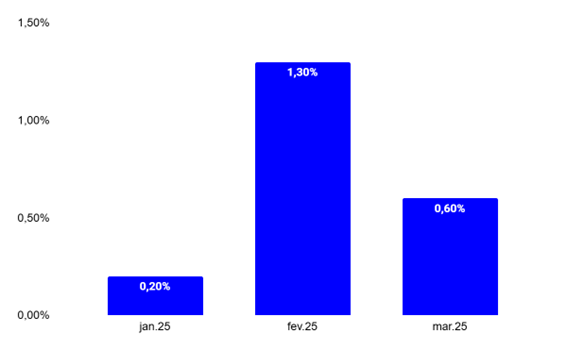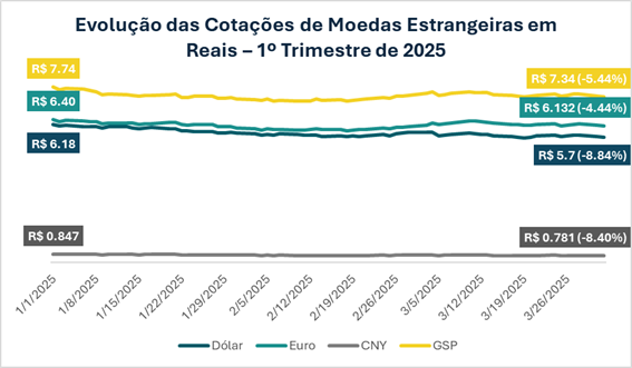 As expectativas de inflação para 2025 foram revistas para cima ao longo do trimestre. Em março, o Boletim Focus indicava uma projeção de 5,65% para o IPCA de 2025, acima da expectativa de janeiro (+0,14 p.p). Esse aumento na expectativa da inflação é justificado pelo aumento da incerteza relacionada aos efeitos do aumento das tarifas, implantadas pelo governo dos Estados Unidos, este fato fez com que o dólar americano saísse de R$6,18 no início do ano e terminasse o trimestre no valor de R$5,70.